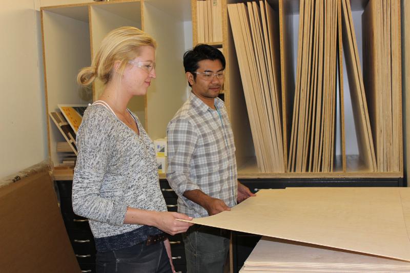 Amary Frenz (left) and Semar Prom are shown at the new College of Environmental Design materials store, one recent example of an Innovation Grant awarded by Equity & Inclusion.