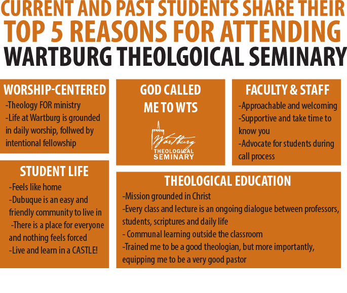 | Our Mission Wartburg Theological Seminary serves Christ's church through the Evangelical Lutheran Church in America by being a worship-centered community of critical theological reflection where learning leads to mission and mission informs learning.