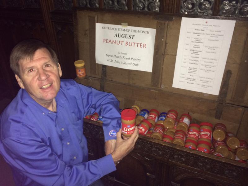 Engaging the Community in Good Works: A Short Story About Mission and Peanut Butter | |  Sometimes, Christians are called to do good works for the sake of others. Sometimes, Christians fulfill God's mission by igniting others to do good works. Here is one such story. Don, who retired from being the Kroger Regional Manager recently, decided he was going to use his "free time" in retirement to do good things for others. Among other acts of service, he drives the church van on Sundays, picking up members who are unable to drive themselves to worship. This month, while reading his Take It Home, he saw the announcement about the Item of the Month: peanut butter for the Open Door Food Pantry at St. John Episcopal Church in Royal Oak. He hatched a plan. In his "free time," he went all over Oakland County to Kroger stores, asking them to donate peanut butter. Cases of it. Then, he asked his dentist, his doctor and stockbroker. "C'mon. You got $20 you can spare." They did. On August 29, Don delivered 182 jars of peanut butter that our local community donated to our church's calling to feed the hungry. "They'll see me again next month, when we collect paper goods as the Item of the Month. They'll get used to it."