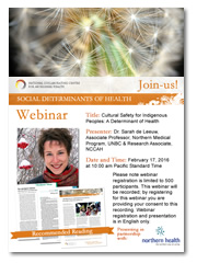 |  | A second webinar, co-hosted with Northern Health, was held on February 17, 2016 on "Cultural safety for Indigenous peoples: A determinant of health." Dr. Sarah de Leeuw, Associate Professor in the Northern Medical Program, University of Northern British Columbia and a Research Associate for the National Collaborating Centre for Aboriginal Health, explored how racism has manifested in the way health care services are provided to Indigenous peoples and is thus a barrier to their optimal health. Specifically, the presentation highlighted the ways in which Indigenous people have expressed their realities of experiencing racism, and discussed ways that healthcare professionals might engage with the arts and humanities in order to more deeply reflect on their thoughts about racism and Indigenous peoples. The webinar attracted great interest, with 366 participants in attendance. (Webinar Resources |  View archived announcement)