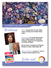 |  | On January 27, 2016, Métis historian Dr. Brenda MacDougall and Brodie Douglas, a representative from Métis Nation BC, presented a webinar entitled "Knowing who you are: Métis history, identity and the Métis Nation today". This webinar explored the historical and contemporary identity and influence of Métis people in Canada. Dr. MacDougall overviewed the historical context in which the Métis Nation was born and highlighted the importance of knowing one's identity and history to a strong and healthy nation, while Mr. Douglas provided thoughts on the contemporary challenges and advances of Métis people in Canada. The webinar was attended by 163 participants. (Webinar Resources |  View archived announcement)    Dr. Macdougall