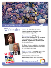 Le 27 janvier 2016, l'historienne métisse Brenda MacDougall et Brodie Douglas, un représentant de la Nation métisse de la Colombie-Britannique, ont présenté un webinaire intitulé Se connaître soi-même : Histoire et identité des Métis et la nation métisse aujourd'hui. Ce webinaire explore l'identité et l'influence historique et contemporaine des Métis au Canada. Mme MacDougall a présenté une vue d'ensemble du contexte historique de la naissance de la nation métisse en soulignant l'importance de connaître son identité et son histoire comme indicateur d'une nation forte et saine, alors que M. Douglas a présenté des réflexions sur les défis et les programmes contemporains des Métis au Canada. Le webinaire a rassemblé 163 participants.