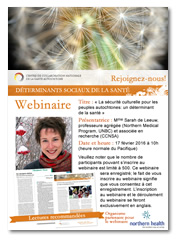 Un deuxième webinaire, coparrainé par Northern Health, a eu lieu le 17 février 2016. Il portait sur La sécurité culturelle pour les peuples autochtones : un déterminant de la santé. Mme Sarah de Leeuw, professeure agrégée du Northern Medical Program, University of Northern British Columbia, et associée de recherche au Centre de collaboration nationale en santé autochtone, a exploré comment le racisme a influencé la façon dont les services de santé sont dispensés aux peuples autochtones et comment il demeure un obstacle à leur santé optimale. Plus précisément, la présentation a mis en évidence les façons dont les peuples autochtones ont exprimé la réalité de leur expérience du racisme et elle a proposé des moyens que les professionnels de la santé pourraient déployés avec l'appui des arts et des sciences humaines pour explorer plus avant le sujet du racisme et des peuples autochtones. Le webinaire a suscité un grand intérêt; quelque 366 participants y ont assisté.
