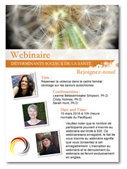 Un webinaire, Repenser la violence dans le cadre familial : centrage sur les savoirs autochtones, a eu lieu le 10 mars 2016. Les présentatrices étaient Mme Sarah Hunt, Mme Cindy Holmes et Mme Leanne Betasamosake Simpson. Mme Hunt et Mme Holmes ont commencé le webinaire en présentant leurs recherches sur la manière dont la violence familiale et les solutions à cette violence dans les communautés autochtones ont été formulées au Canada au cours des 20 dernières années. En faisant appel à la narration numérique et aux philosophies anichinabées au sujet des familles, des relations saines, des perspectives holistiques de la santé et de la nature relationnelle du bien-être, Mme Simpson a présenté des enseignements visant à encourager une remise en question de la violence familiale dans le contexte des visions du monde autochtone. Le webinaire s'est terminé par une série de questions dont les 203 participants pourront s'inspirer pour poursuivre la réflexion et la discussion dans leurs propres contextes culturels et communautaires.