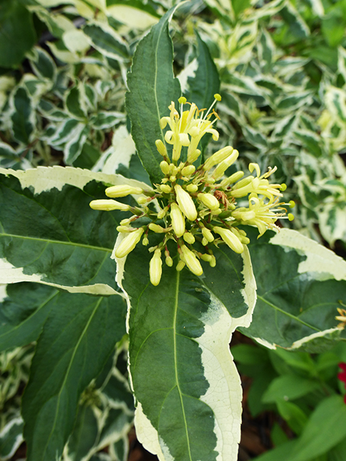 In June and July this hardy shrub puts on quite a show as it opens its fragrant buttery yellow blooms in the landscape. However, even when not in bloom, the variegated foliage makes it a welcome addition to the garden. Here in Iowa it develops best color in full sun, but farther south partial shade may improve performance. It grows 2-3 feet tall with an arching, spreading habit. Occasional suckers develop, but this shrub will not become invasive.