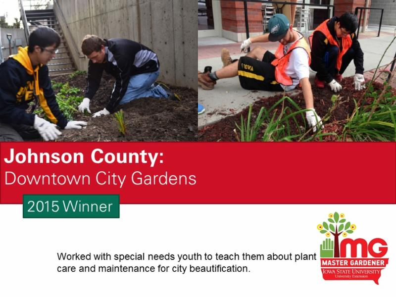 Congratulations to the Johnson County Master Gardeners who won a 2015 Search for Excellence Award for their Downtown City Gardens project. In Iowa City, Master Gardeners partnered with local organizations to teach youth about planting and maintaining public gardens. If you have a youth-oriented garden project that you would like to submit as an award application for next year, click here to learn more. Applications are due March 15, 2016.
