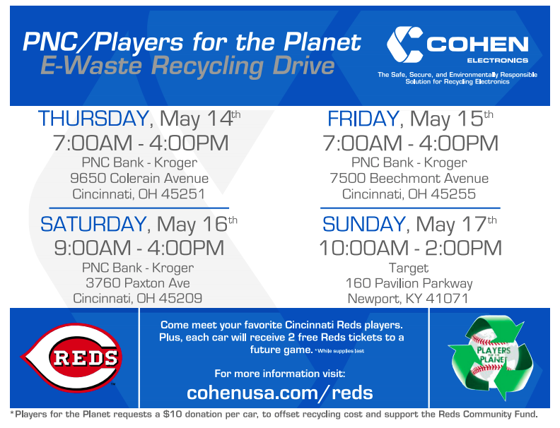GU's Waste Reduction Action Team and other GU member organizations are helping to organize an E-waste recycling drive in May to help residents get rid of dangerous electronic waste. From May 14-17, residents can drop off old electronics for recycling at the locations listed below and receive two tickets to a Reds Game along with the chance to meet their favorite Reds players! For more information, click here.