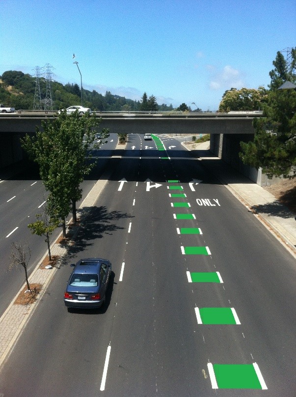 On August 18, 2015, the City Council approved the implementation of green conflict zone striping in the new bike lane along northbound Camino Pablo between the BART entrance/exit and Santa Maria Way. The green striping is intended to improve traffic safety by bringing more awareness to motorists of the presence of cyclists in the area. The dashed green striping allows motorists to merge across to enter into an adjacent traffic lane. The solid green striping are restricted areas for bicyclists for which motorists are not allowed to cross or enter. The striping is expected to be installed within the next several weeks. If you have any questions, please feel free to contact Senior Civil Engineer, Larry Theis at (925) 253-4260 or Ltheis@cityoforinda.org.