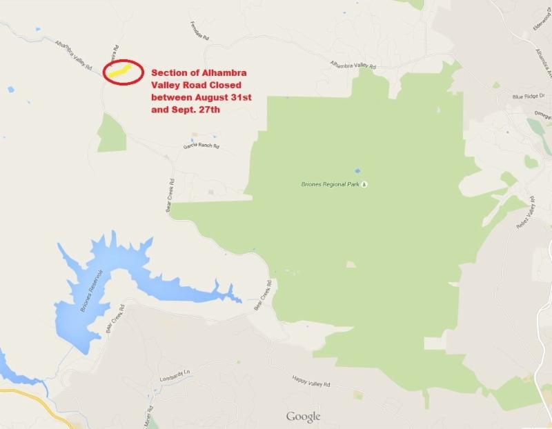 The Contra Costa County Public Works Department will fully close Alhambra Valley Road one half mile east of the intersection of Bear Creek Road for a period of four (4) weeks. This will begin 7:00 a.m. on Monday, August 31, 2015 through 5:00 p.m. on Sunday, September 27, 2015, for the purpose of constructing the Alhambra Valley Road Safety Improvements Project. The improvements include slide repair and grading for pavement widening, culvert extensions, and road reconstruction. Electronic message boards were placed on the Bear Creek Road at the Camino Pablo intersection and on Happy Valley Road at the Bear Creek Road intersection. Motorists are encouraged to find alternate routes such as Highways 4 or 24. Emergency vehicles will have access to the area during construction. Please contact the County's Resident Engineer, Sunny Jhutti at (415) 246-4920 or email SunnyJ@Hannagrp.com for additional information, questions, or concerns. (See map below)