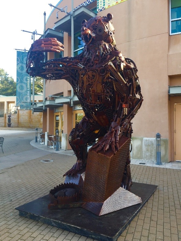 In case you haven't noticed, there's an 11' 6" size bear in front of the Orinda Library. Ursus Redivivus, a monument to the California Grizzly Bear, is a carefully assembled, life-sized piece made entirely of recycled junk and scrap metal. Ursus is a kinetic sculpture created by Artists Alex Nolan and Chad Glashoff. This wonderful piece was brought to Orinda by the Art in Public Places program, ArtSpace Orinda, which has been placing outdoor sculptures in the Orinda community since 2007. Its mission is to recognize artists as important cultural resources, and to install artwork throughout the City to broaden public awareness and encourage dialogue about public art. For more information about this program visit www.artspaceorinda.org.
