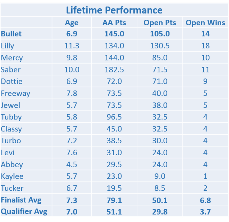 2014 Top Dams of Qualifiers 4 Qualifiers FC-AFC Hurricane Breeze 3 Qualifiers FC-AFC M and M's Buns of Steel FC-AFC Tequilla Sunrise IX FC-AFC Watermark's Mardi Gras FC-AFC Windy City's Secret Signal 2 Qualifiers FC-AFC Drake's Bay Kate's Choice Fern Cobble's Contesse FC-AFC Pattons Blazen Abby FC-AFC Trumarc's Lean Cuisine FC Fat City Juice Seaside Monster's Inc Litters And what about those elusive "nicks," where the combination of the sire and dam produces a powerful result?