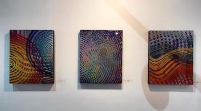 Created with oil, spray enamel, gold leaf and multiple layers of epoxy resin on wood panels, these paintings are luminous with lots of depth. They have been well received both locally and in New York. I hope you can join me Friday evening. More