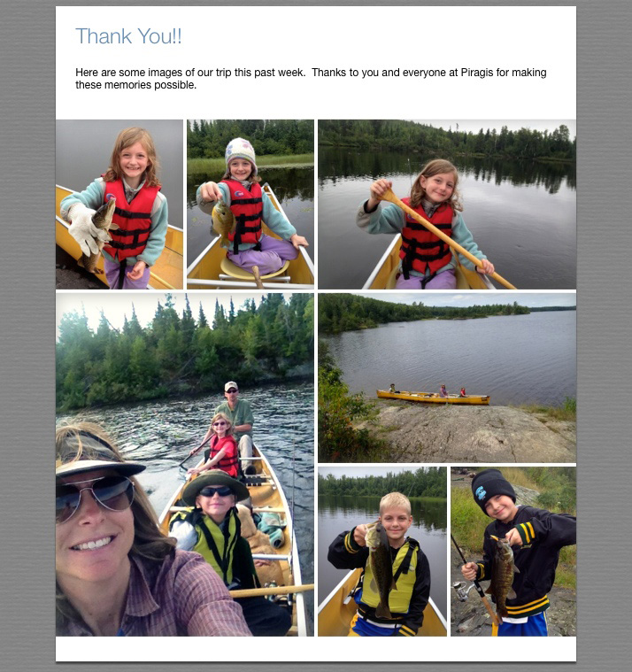 I sent some images from our trip but also wanted to follow up with a quick note. Renae and I wanted to express our sincerest gratitude again to you, Piragis and all the staff. Our kids have now elevated you to "hero" status for the use of the MN 4. Henry's word, not mine. What an incredibly versatile canoe. We had four packs, two adults, two kids and a dog and never felt crowded. Renae did her best to fit us all in her "canoe selfie."