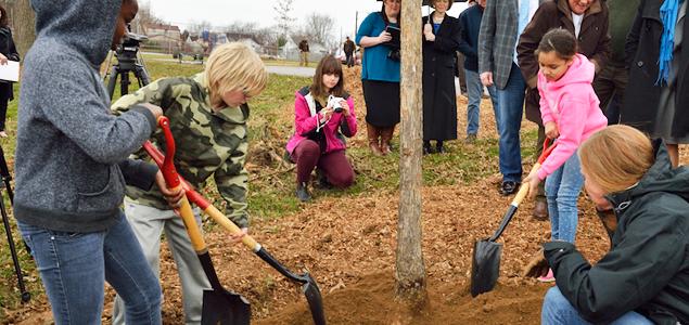 Several Medora Elementary fourth-graders joined Louisville Mayor Greg Fischer, JCPS Superintendent Donna Hargens, and TreesLouisville Executive Director Cindi Sullivan to plant a Swamp White Oak during a news conference last month. Click here for video.
