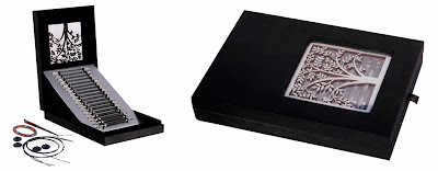 The Karbonz Box of Joy interchangeable needle set comes beautifully packaged in a box with a a laser cut "tree of bloom" design that allows the Karbonz needle tips to peek through. The set contains nine sizes for your knitting pleasure: US sizes 4, 5, 6, 7, 8, 9, 10, 10.5 and 11 (3.5, 3.75, 4.0, 4.5, 5.0, 5.5, 6.0, 6.5 & 8.0mm) along with 4 cords (one each of 24" & 40" and two of 32"), 1 set of cord connectors and a complimentary Shawl Pin from the new Azure Charm collection