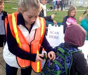 Volunteer school teams using Active4.me conduct weekly (or monthly) scan days at school entrances. As students arrive on campus, parent volunteers and/or student green teams scan barcodes located on a mini-sneaker that hangs from the child's backpack. A student receives a scan if they arrive to school by foot, bike, scooter, skateboard, carpool or bus. Active4.me reports can provide students with immediate feedback on their green trip totals. (read more)