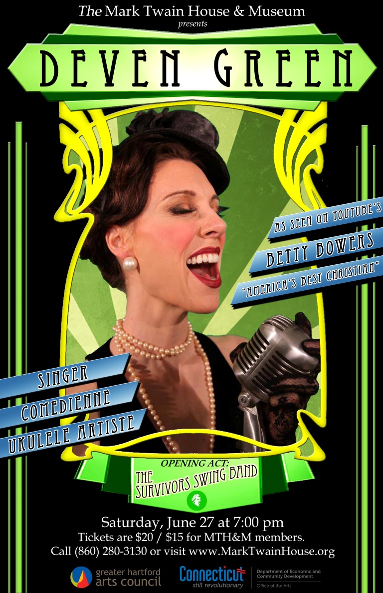 Deven Green, the star of BETTY BOWERS: AMERICA'S BEST CHRISTIAN and the "Welcome to My..." Parody videos on YouTube, brings her electric ukulele lounge act to the Webster Bank Museum Center at the Mark Twain House & Museum! Join us for one of the funniest, most subversive comediennes working today. Opening for Deven is the Survivors Swing Band--the oldest member is 94! Plus they'll be joining Deven for a number or two.
