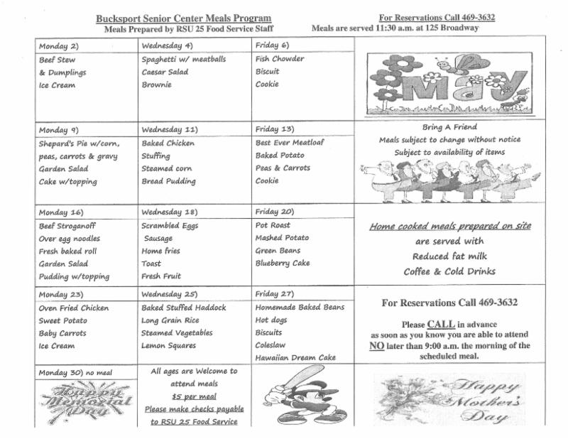 Bucksport Senior Center Meals program. Meals are served at 11:30 a.m. at 125 Broadway. Everyone is welcome. For reservations call 469-3632. Download the May meal schedule (.pdf).