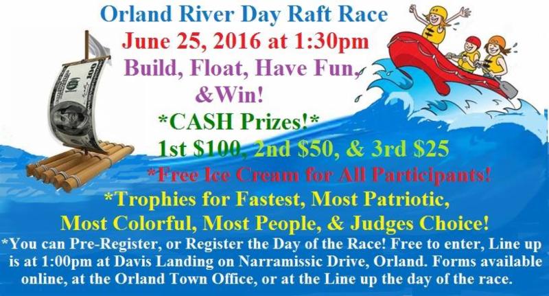Let's make the 2016 Orland River Day Raft/Float Race the BEST EVER on Saturday, June 25th, 2016 at 1:30p! Build, Race/Float, Have Fun, & Win Cash Prizes, Trophies, & Free Ice Cream for all Participants! No entry fee, we are hoping for HUGE turnout!