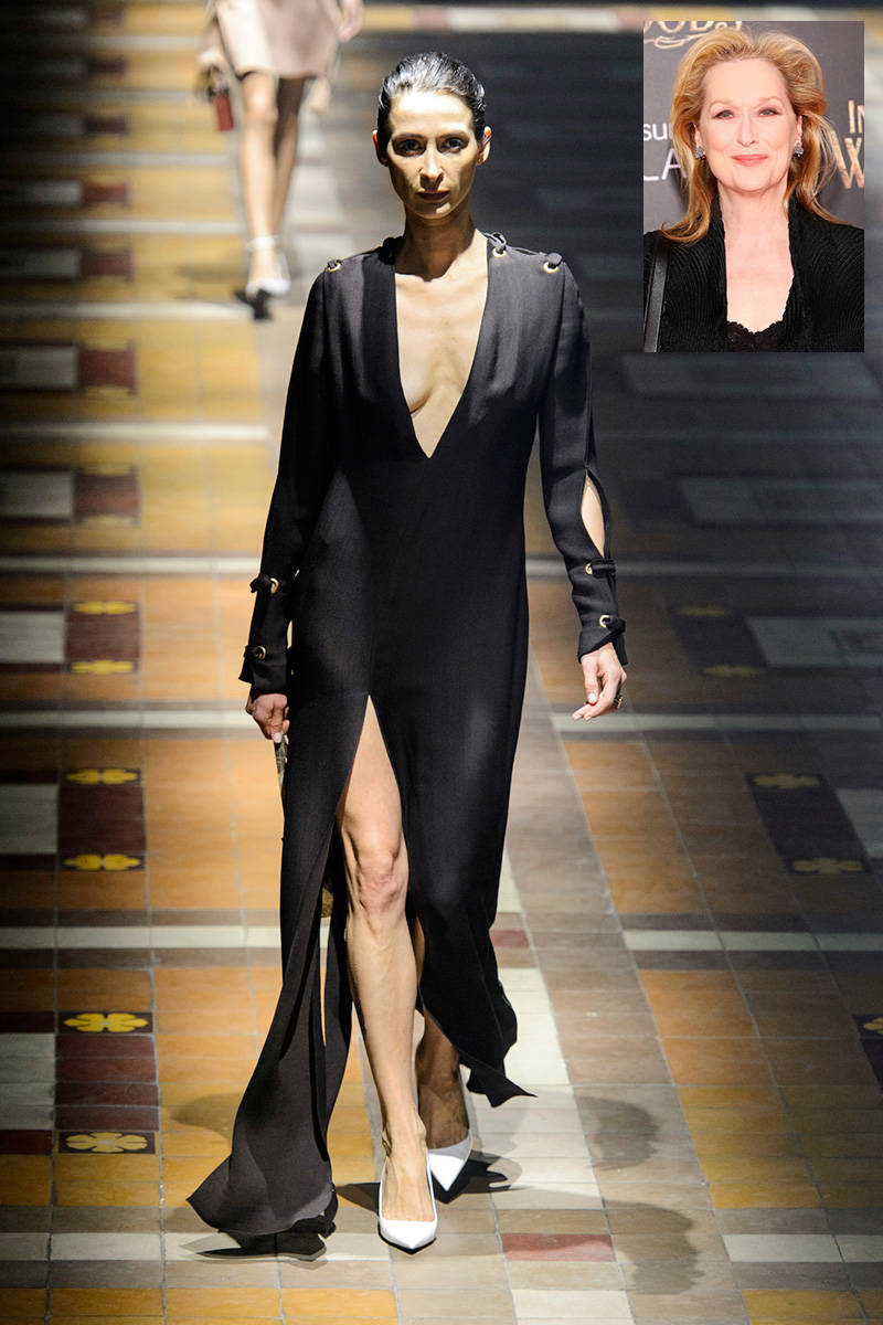 When Meryl Streep saw the dress Harper's selected for her, I'm going to guess she rolled her eyes and laughed out loud (and not in a good way). I bet her eyes lit up, however, when she saw the black dress they chose for Julianne Moore. This would be great on Meryl. She would love the relaxed comfortable cut, the cinched waist and the pockets! It's shapely, modern and modest. And she could wear boots which she enjoys wearing upon occasion. This whole look is perfect for a more mature curvy woman. And chances are Julianne Moore would be glad to wear the dress with the plunging neckline if it were altered just a touch. Decrease the plunge, and sew down the slit a couple of inches, it would remain edgy and sheer and I think she would like that. Julianne is up for Best Actress in the film Still Alice which is in limited release at the moment. I will wait and see what Rotten Tomatoes ( best movie web site out there) says before I go to the theater to see it. Ok, Meryl and Julianne; you know what to do.