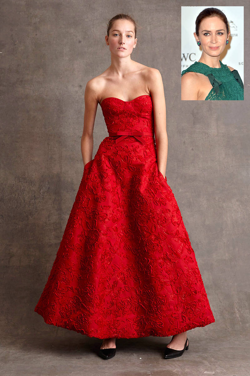 Emma is a sassy classy redhead (I have seen her interviewed a number of times) and only 26 years old. The red dress, not the green, is the right choice for her. No doubt about it. With it's full skirt, pockets and youthful bow at the waist, it would look remarkable on her. And that intense red color is going to be spectacular with her red hair. So let's switch these two, shall we? The red dress for Emma Stone and the slinky fitted number for Emily Blunt. If you will notice, this streamlined sheath dress is a cool green color and it compliments Emily's green eyes beautifully. She plays the cunning baker's wife in the movie Into the Woods, a role for which she too has been nominated. Upon the recommendation of contest winner nephew Brian Pipal, I saw the movie and I thought Emily was outstanding. I may even see it again.