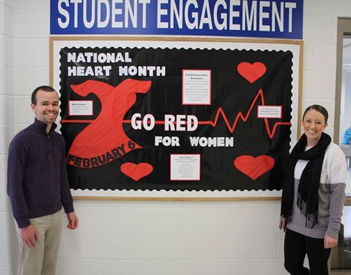 February is National Heart Month. Nursing students Sean West and Kelli Ritchison created this bulletin board to bring awareness to National Heart Month and Go Red for Women. The American Heart Association notes that 1 of 3 women will die from heart disease or stroke. The CDC notes that heart disease is the number one killer of both men and women.