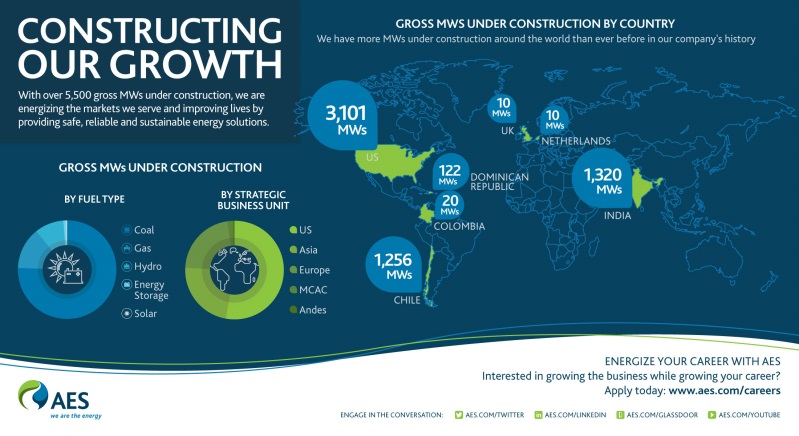 With more than 5,500 gross MWs under construction, we are energizing the markets we serve and improving lives by providing safe, reliable and sustainable energy solutions. As development activities aimed to grow the company at a fast pace continues, we are seeking people that will help us develop, engineer, construct and bring projects online on time and within budget. Check out this infographic on the new AES.com to learn more about our various construction projects in the markets we serve and apply to help grow the business today while growing your experiences and skills.
