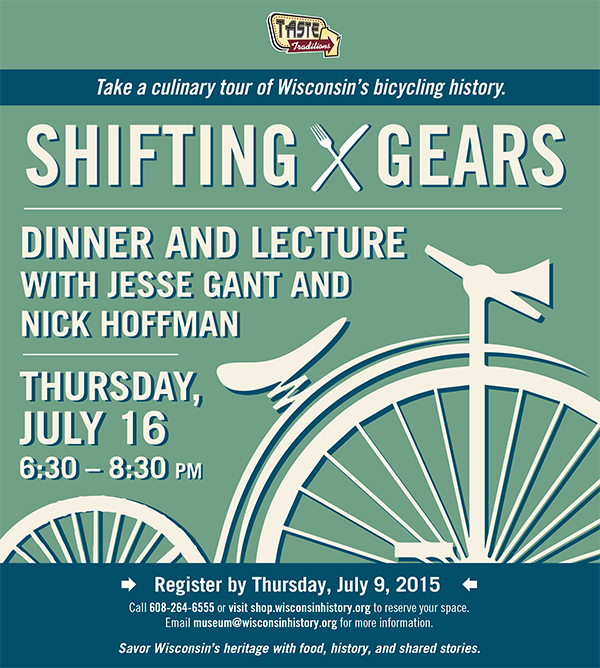 Riding a bike is a sure way to fire up your appetite! Join Jesse Gant and Nick Hoffman, the co-authors of Wheel Fever: How Wisconsin Became a Great Bicycling State, as they take guests on a culinary tour of Wisconsin's bicycling history. Beginning at 5:30, guests of the event will have a chance to privately view "Shifting Gears" with Nick Hoffman, co-curator of the exhibit. After viewing the exhibit, ride with Jesse and Nick all the way back to the late 1860s, when "Velocipede Mania" first seized Wisconsin residents. Travel forward through the bicycling-friendly restaurants, hotels, and clubhouses that have populated nearly 150 years of state history. Along the way, learn how wheelmen and wheelwomen helped prepare the foundations for a great bicycling state. A themed dinner will accompany the presentation.