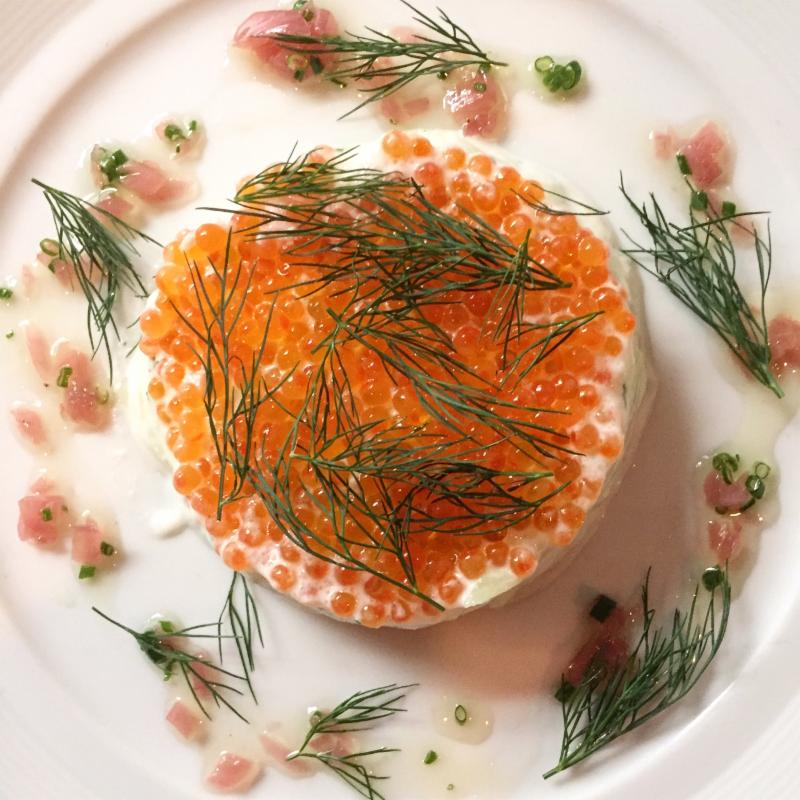 Chef Brian pays an homage to his mother with this dish! Her famous cucumber salad is at the center, and Chef tops it with Trout Roe and Dill...