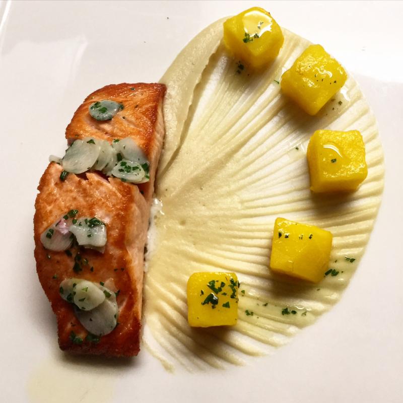 | | Salmon, Sweet Garlic, Fennel, and Saffron Potatoes |