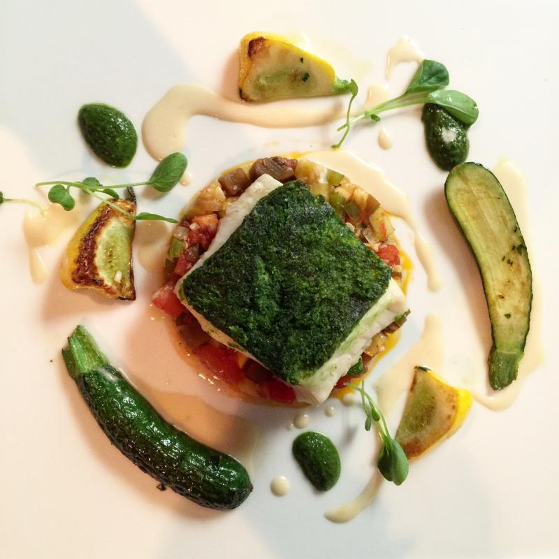 | Halibut Crusted with Herbs from Chef Brian's Garden, Summer Squash, and the French favorite: Ratatouille!
